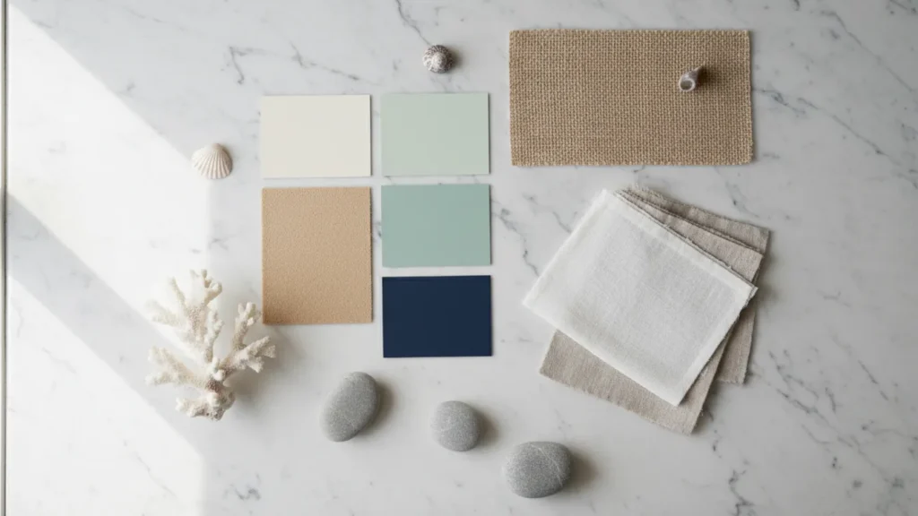 Don’t limit yourself to just blues though. Seafoam green adds freshness. Coral brings warmth and energy. Sandy taupe grounds everything. Even touches of black can work for contrast in a modern coastal space.
