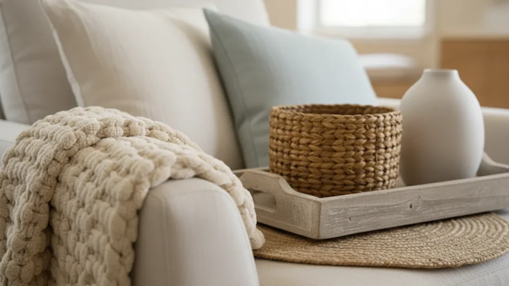Layer different textures throughout your room. A chunky jute rug underfoot. Linen throw pillows on the sofa. A woven basket for blanket storage. Wooden bowls and trays on surfaces. This creates visual interest without adding clutter.