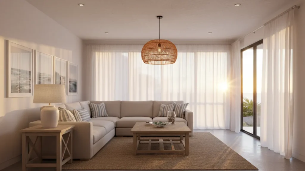 Consider installing dimmer switches if you don’t have them. They let you adjust ambiance easily – essential for creating that relaxed coastal living room atmosphere.