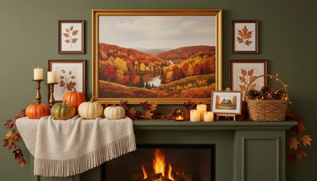 Your mantel is the perfect place to display seasonal artwork or fall-themed signs. A large mirror can make the space feel bigger while reflecting your decorative elements. Framed prints with fall quotes or autumn landscapes set the seasonal tone.
