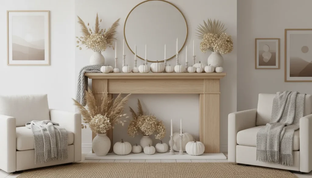 Here’s where things get elegant. A neutral fall mantel uses whites, creams, beiges, and soft grays to create a sophisticated autumn display that won’t overwhelm your space.