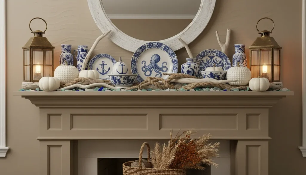 Yes, you can do coastal fall decor! It’s all about blending beach elements with autumn touches. White pumpkins, driftwood, sea glass, and natural rope create a fall mantel with beachy vibes.