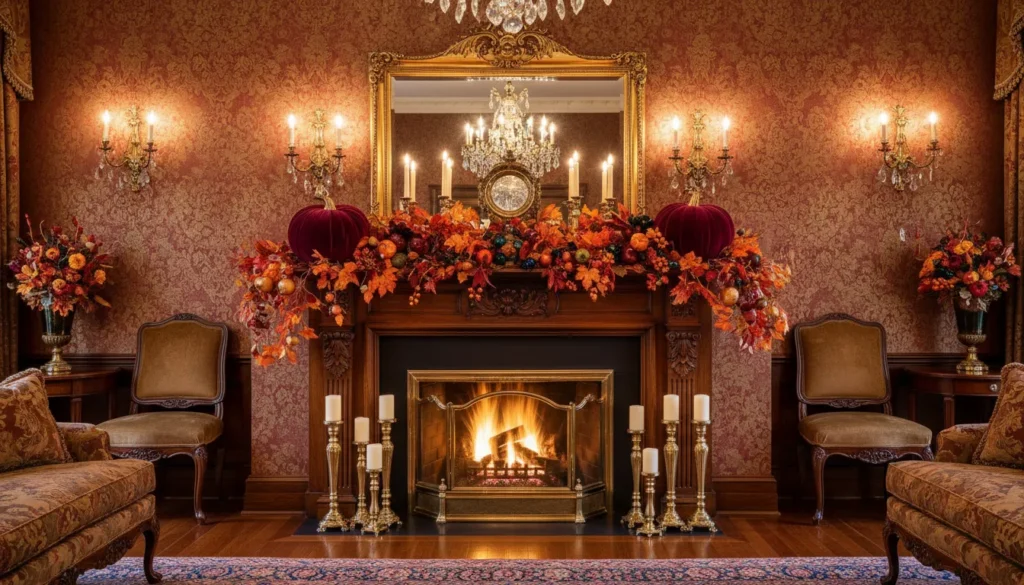Candlesticks in varying heights, a central mirror or artwork, and matching garlands create that formal, elegant feel. Add velvet pumpkins, silk fall foliage, and perhaps some mercury glass elements for that sophisticated shimmer.