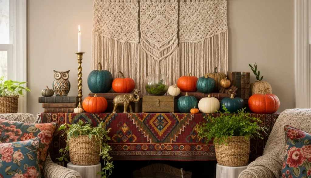 Mix vintage finds with modern elements, combine different color palettes, and don’t be afraid to add quirky personal touches. A macramé wall hanging next to traditional pumpkins, some boho candles, and maybe ethnic textiles draped casually can create something uniquely yours.
