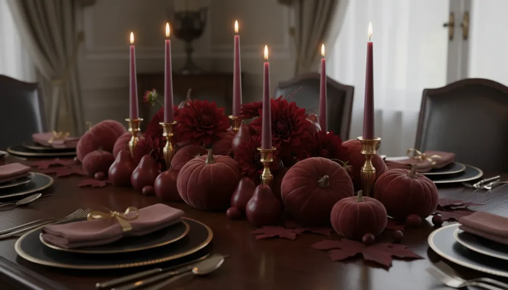 Or go deep and moody with burgundy: burgundy dahlias, plum-colored candles, deep red pears, and wine-colored taper candles on gold candlesticks. The monochromatic approach feels intentional and polished.