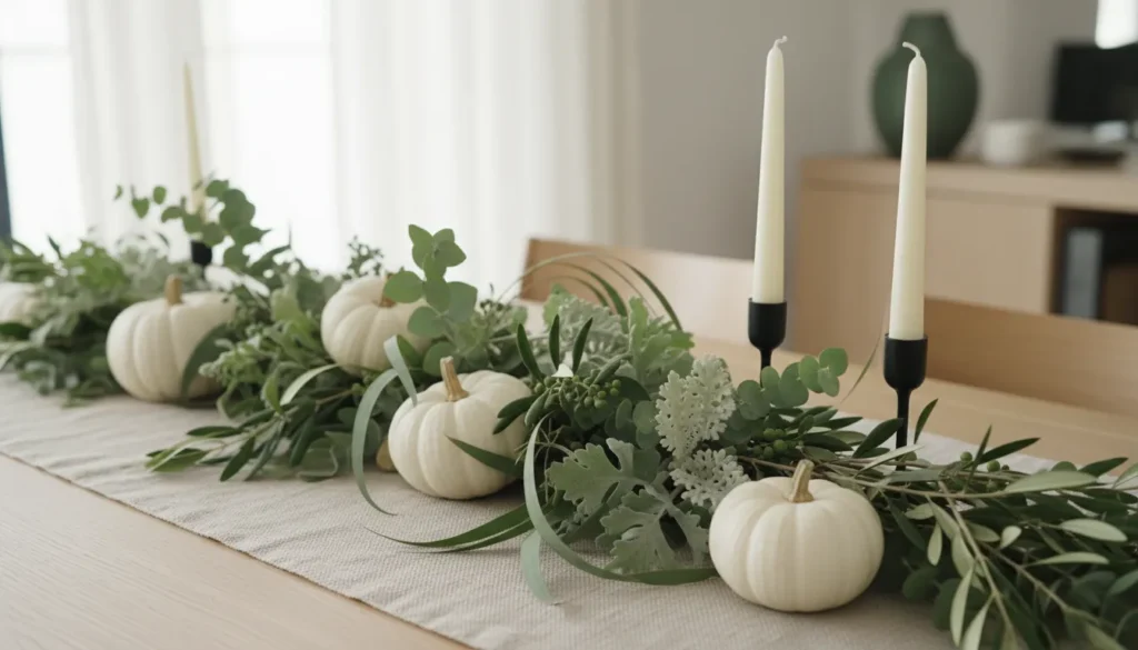 Pair sage greenery with white pumpkins and cream candles for an Instagram-worthy display that feels current. This color scheme photographs beautifully and works across decorating styles.