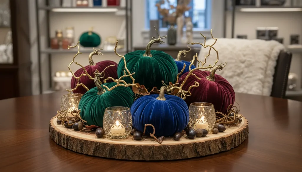 Mix velvet pumpkins with natural elements like wood and greenery to prevent arrangements from feeling too precious. The combination of luxe fabric and organic materials creates interesting contrast.