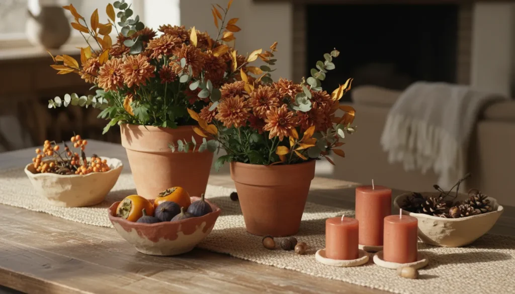 Earth-toned pottery and terracotta pots bring warmth to fall table centerpieces. This trend connects to the broader renaissance of artisanal, handmade items in home decor.