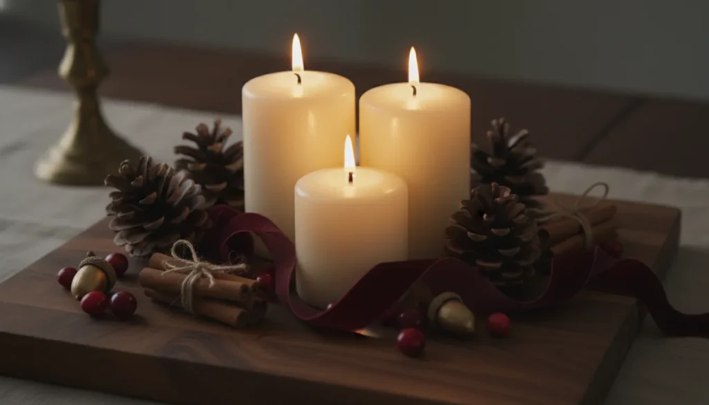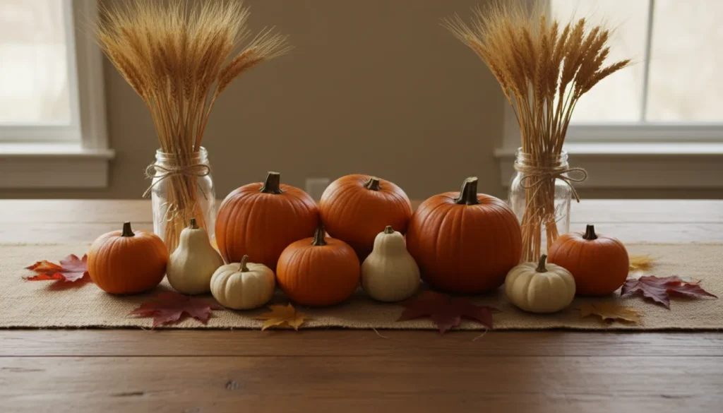 For non-dining displays, subtle scent works: vanilla, apple cider, or light cinnamon enhance autumn atmosphere without overwhelming.