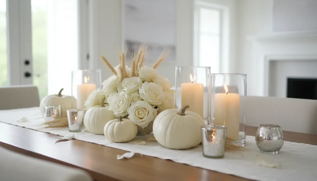 Don’t forget about neutrals. White pumpkins have become incredibly popular for elegant fall centerpieces because they work with any color scheme. Gray weathered wood adds texture without competing with your focal elements.
