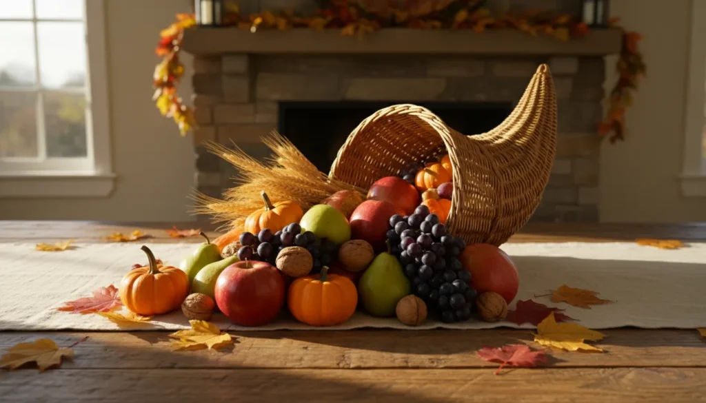 Create a cornucopia-style display overflowing with squash, pumpkins, apples, pears, grapes, and pomegranates. Add wheat stalks, dried corn, and autumn leaves. The visual abundance mirrors the spirit of Thanksgiving gratitude.