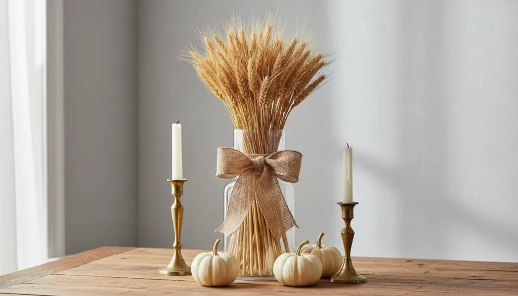 Sometimes the most striking rustic centerpieces are the simplest. A bundle of wheat tied with ribbon creates instant fall atmosphere.