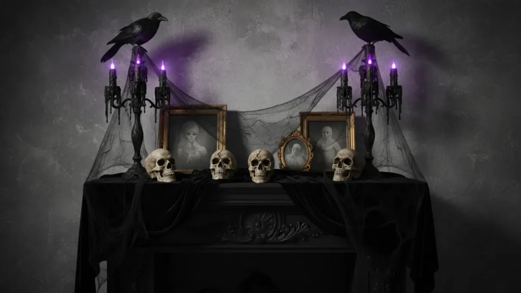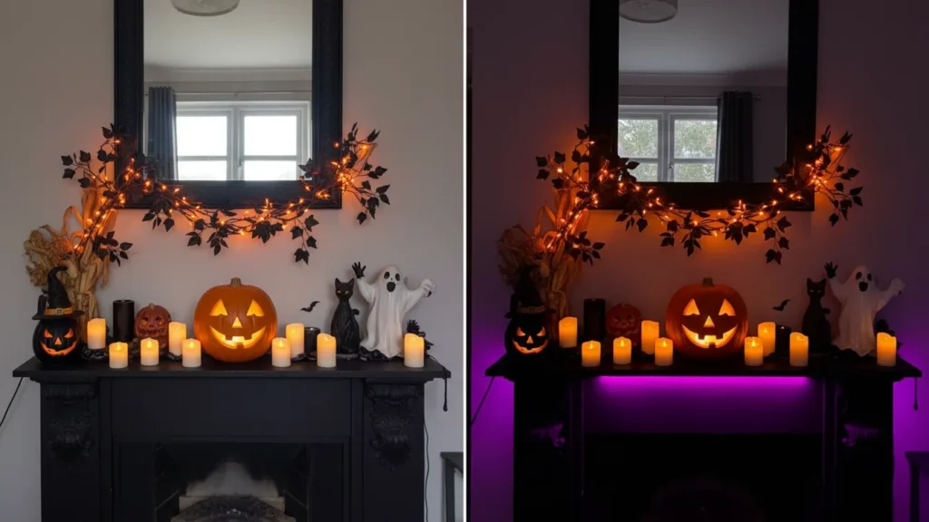 Lighting is crucial here. Purple or orange string lights hidden throughout, plus some strategically placed spotlights, create that haunted atmosphere. A fog machine nearby (if you’re really going for it) can send wisps of fog across your mantel during parties.