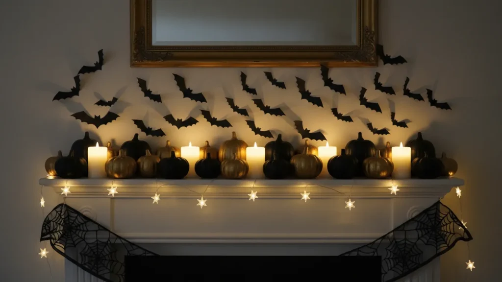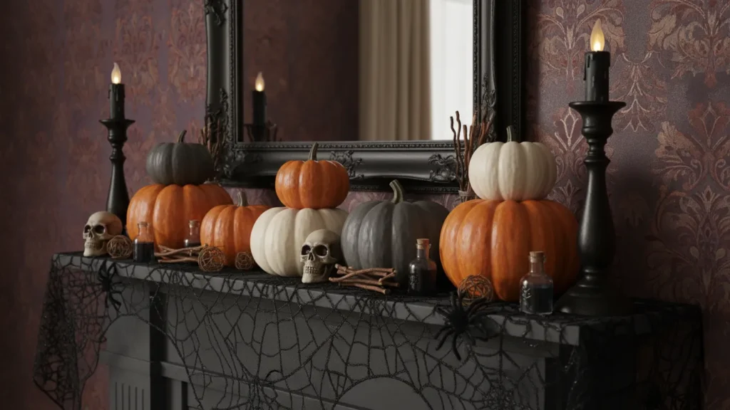 Start with a base of black or deep purple fabric draped across your mantel—velvet looks especially luxurious. Add mercury glass or metallic pumpkins in varying sizes. These catch light beautifully and feel elevated compared to plastic versions.