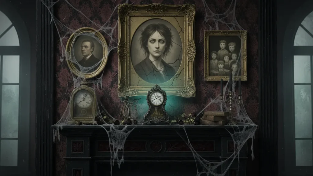 Channel Victorian gothic vibes with ornate frames, vintage portraits with spooky additions, old keys, antique books, and plenty of cobwebs. Everything should feel aged and mysterious.