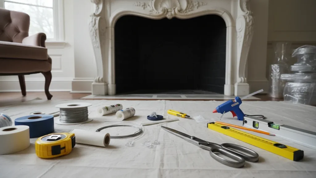 Museum putty or adhesive putty works great for securing items to your mantel surface without damage. For items hung on the wall above, use appropriate hooks or hanging strips rated for the weight. Wire or fishing line can secure garland and prevent sagging.