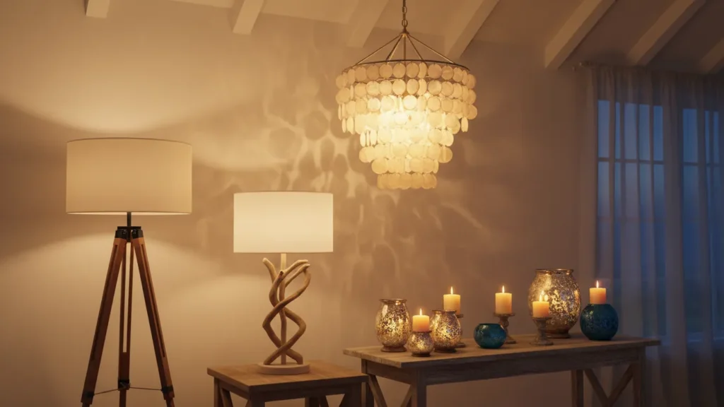 Table and floor lamps with bases made from driftwood, coral replicas, or capiz shells serve double duty as functional lighting and sculptural decor.