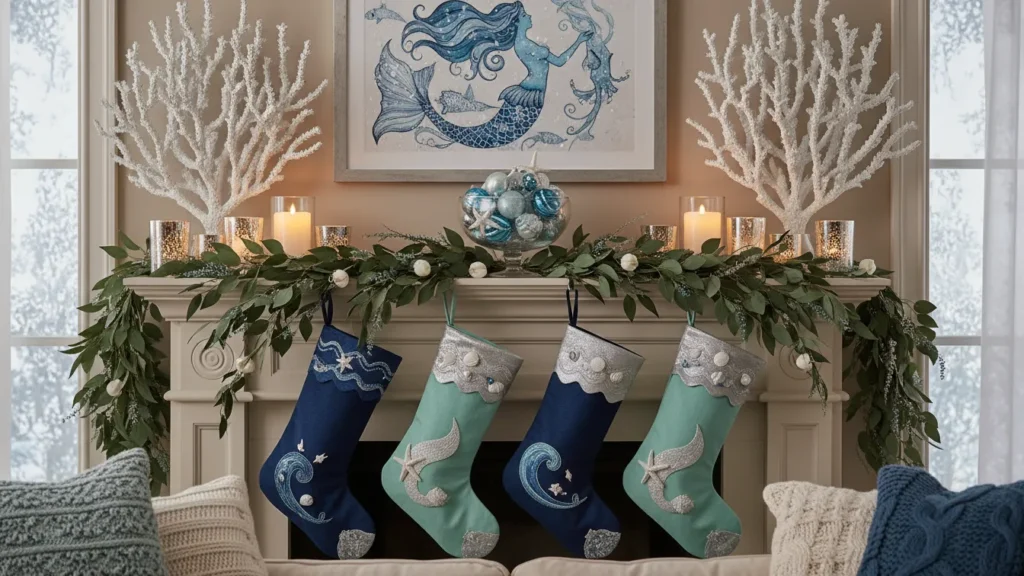 Holiday decorating can absolutely incorporate your mermaid theme. Replace traditional red and green with blues, silvers, and whites. Ornaments shaped like shells, starfish, and glass balls in ocean colors work beautifully.