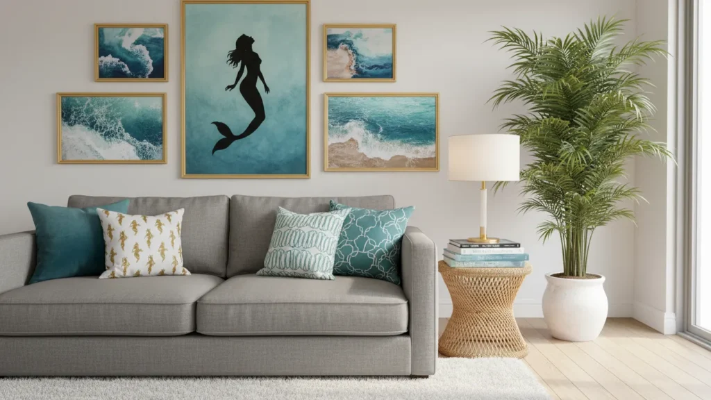 Everything else – side tables, lamps, rugs – should complement these without adding more obvious “mermaid” elements. This creates cohesion without overwhelming your senses.