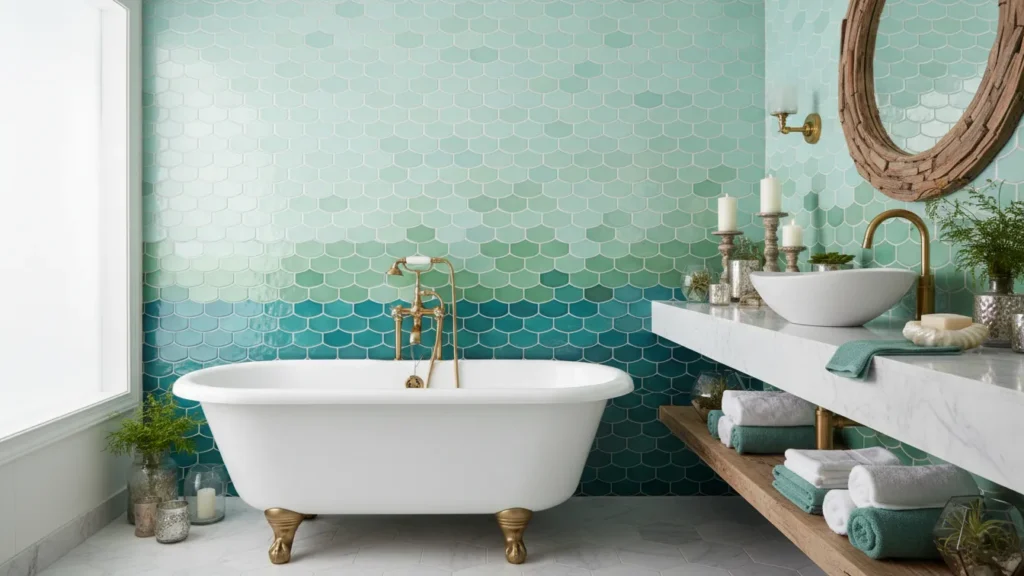 Add some plants if you’ve got good lighting. Ferns and other leafy greens mimic underwater vegetation beautifully. They also help with humidity, which bathrooms appreciate.