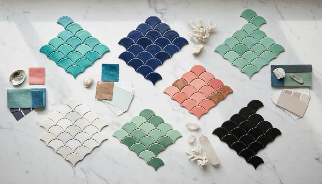 Fish scale tile patterns (technically called Moroccan fish scale tiles) create that iconic mermaid tail look. These overlapping scalloped shapes add texture and visual interest that flat tiles simply can’t match.