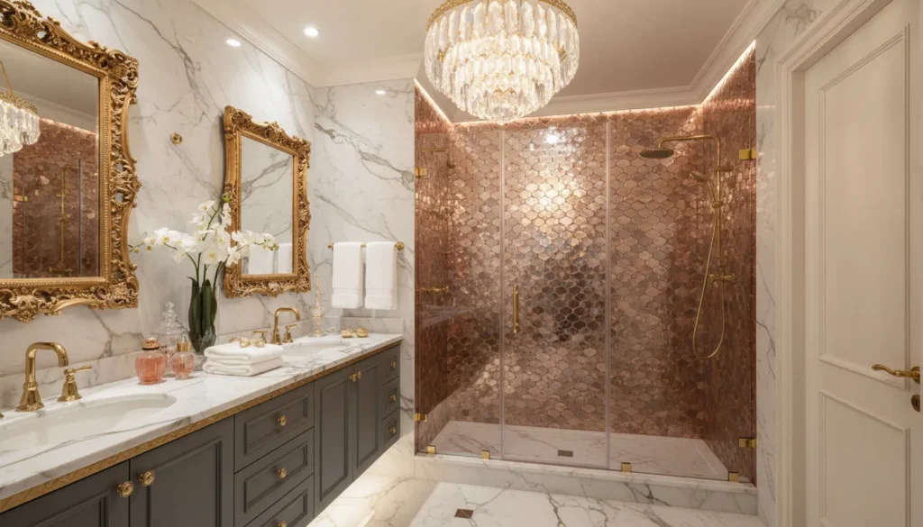 Think rose gold or copper mermaid tiles with metallic finishes, paired with marble countertops and gold fixtures. This combination creates a bathroom that feels like a high-end spa.
