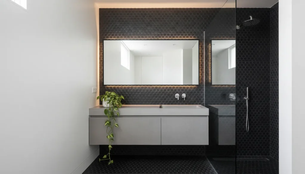 I’ve seen stunning installations where rose gold fish scale tiles cover the entire shower enclosure, reflecting light in the most beautiful way. Add some pendant lighting with crystal elements, and you’ve got yourself a genuinely luxurious space.