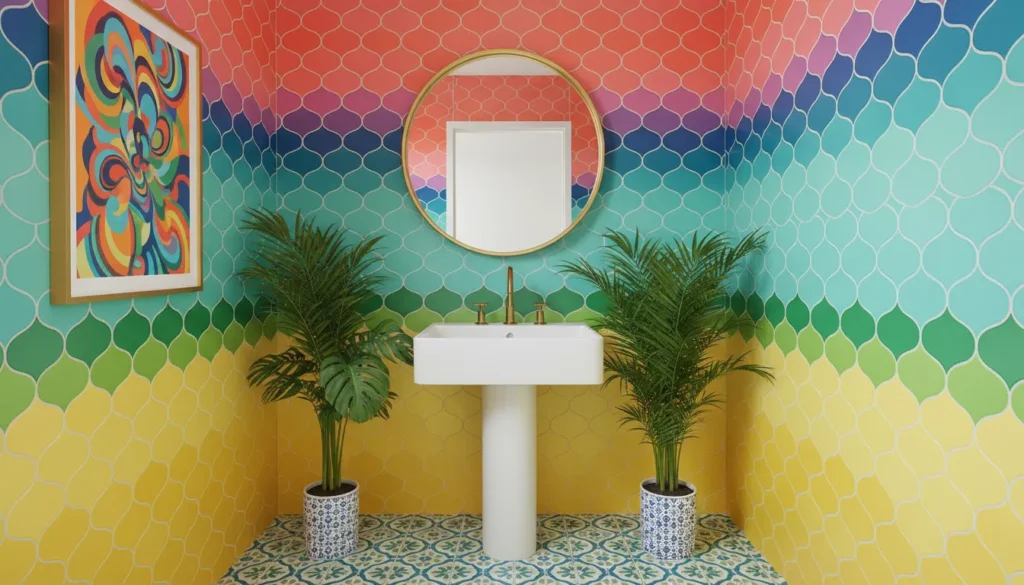 Mix coral pink, turquoise, yellow, and lime green mermaid tiles in a gradient or ombre pattern. This works especially well in powder rooms or guest bathrooms where you can be more adventurous without affecting your daily routine.