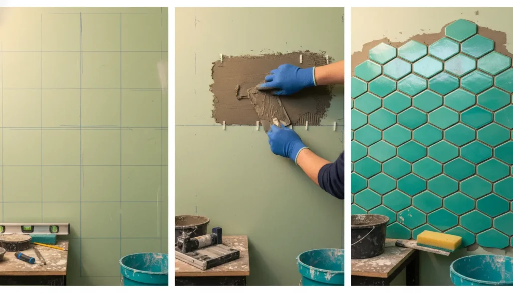 Step 1: Prepare the Surface Your wall must be clean, dry, and flat. Remove old tiles if necessary. Apply cement backer board in shower areas for proper water resistance. Prime the surface if required by your adhesive manufacturer.