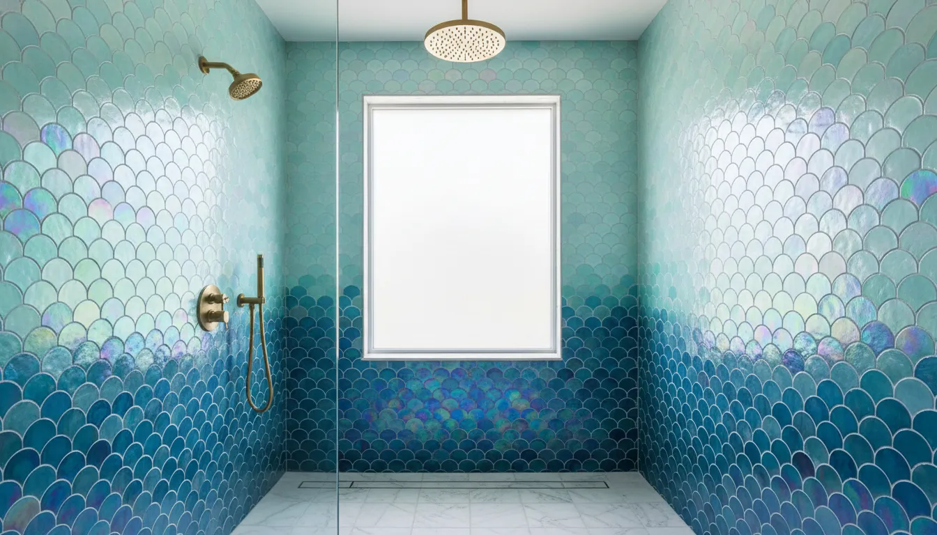 Mermaid tiles are ceramic, porcelain, or glass tiles designed to mimic the iridescent, scale-like patterns you’d imagine on a mermaid’s tail. They typically feature fish scale shapes (also called scallop tiles or fan-shaped tiles), holographic finishes, or ocean-inspired color gradients that shift and shimmer in different lighting.