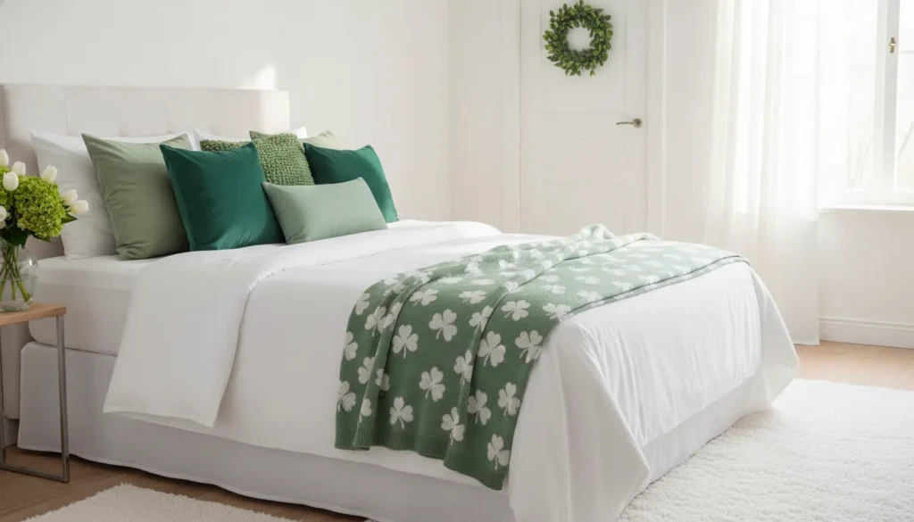 For bedrooms, switch out regular pillowcases for green ones or add a shamrock throw blanket at the foot of the bed. Hang a simple wreath on the bedroom door. Place a small vase with green flowers on the nightstand. These subtle changes acknowledge the holiday without overwhelming your personal space.