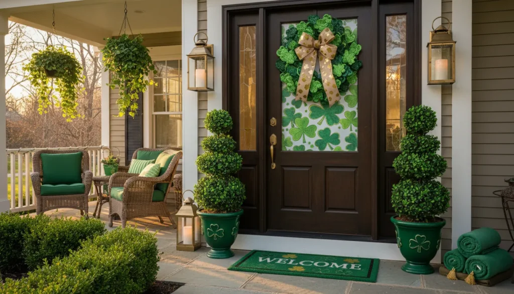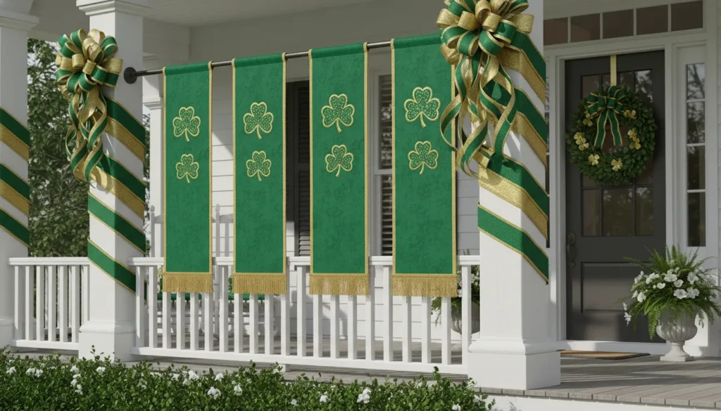 Porch furniture staging creates an inviting scene. Dress chairs with green cushions. Place a small side table with a decorative lantern and shamrock picks. If you have porch columns, wrap them with green and gold ribbon spirals or hang vertical shamrock banners.