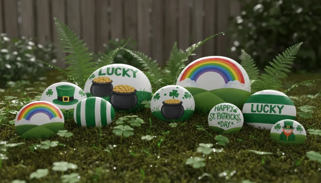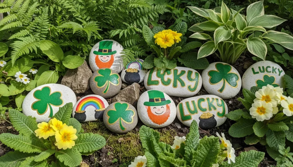 Painted rocks and stones make charming garden decorations. Collect smooth rocks from your yard or purchase river rocks. Paint them green and add shamrock designs, “Lucky” messages, or leprechaun faces. Seal with outdoor mod podge. Scatter them in flower beds or along walkways.