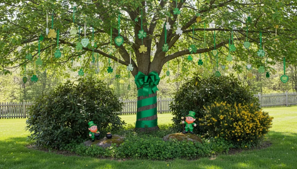 Tree and shrub decorations make use of existing landscape features. Hang shamrock ornaments from branches. Wrap tree trunks with green ribbon. Place small leprechaun figurines nestled in bushes where they “peek out” at visitors—this hide-and-seek element delights children.