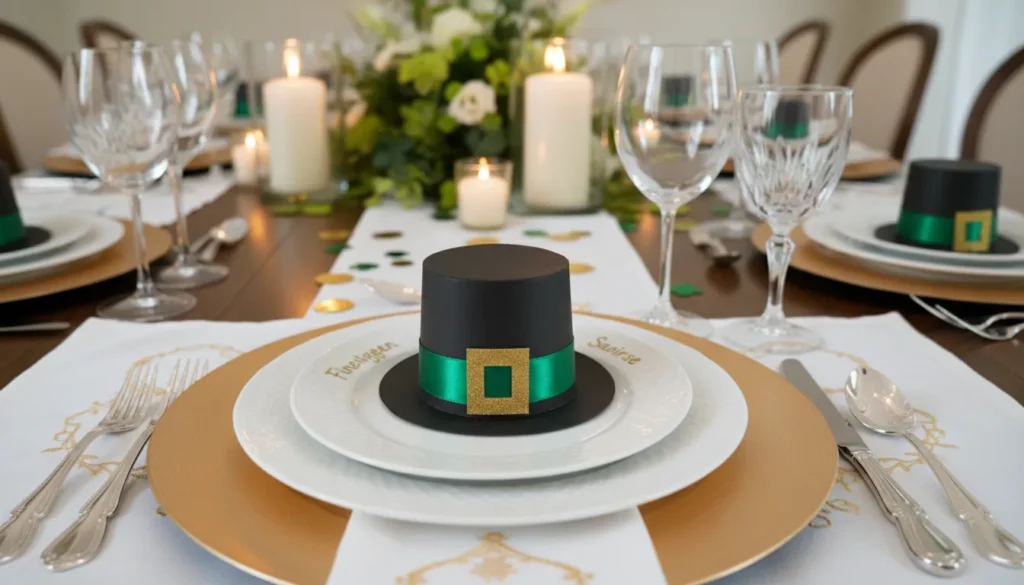 Leprechaun hat place cards combine function with festivity. Cut small leprechaun hat shapes from black cardstock (about 3 inches tall). Add a green band and gold buckle from colored paper. Write each guest’s name on the hat. Stand them on the dining table to mark seating—guests can take them home as favors.