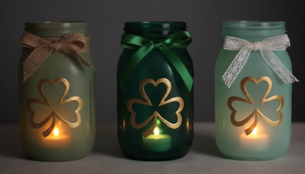 Mason jar luminaries create warm, welcoming light. Paint clean mason jars with green glass paint or regular acrylic in shamrock green. Once dry, add shamrock stencils in gold or white. Place battery-operated tea lights inside for safe illumination. Group several in varying heights for centerpiece displays.