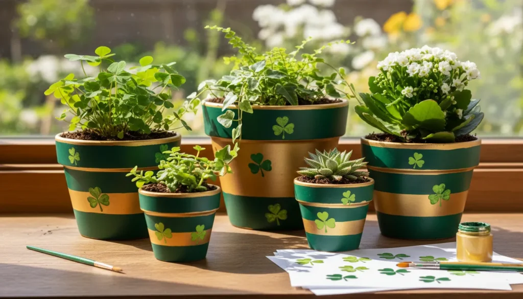 Terra cotta pot transformations are budget-friendly and versatile. Paint standard clay pots with green, gold, and white stripes. Add shamrock stamps or hand-painted designs. Fill with real plants, faux greenery, or use them as utensil holders for buffet tables.