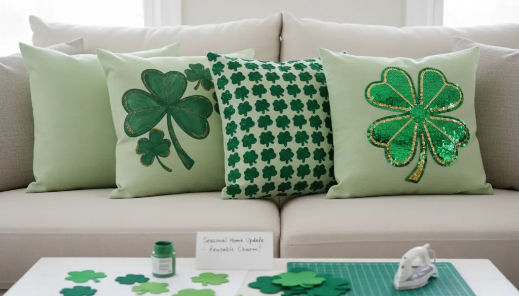 Shamrock pillow covers update existing throw pillows seasonally. Cut two fabric squares slightly larger than your pillow. Use iron-on shamrock appliqués or fabric paint to decorate the front piece. Sew three sides together (or use fabric glue for no-sew versions). Insert pillow and close the fourth side with buttons, Velcro, or additional sewing.