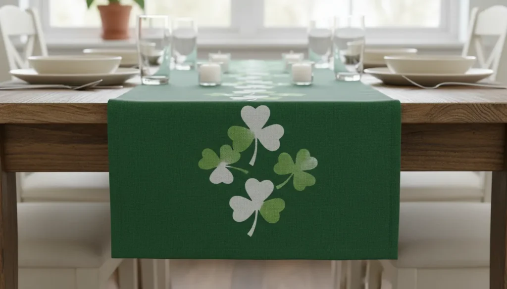 Table runners and placemats customize your dining setup. For runners, cut green fabric to desired length (typically 12-16 inches wide). Hem edges or use hem tape. Add shamrock embellishments, ribbon trim, or stenciled designs. For placemats, cut rectangles about 12×18 inches and finish edges similarly.