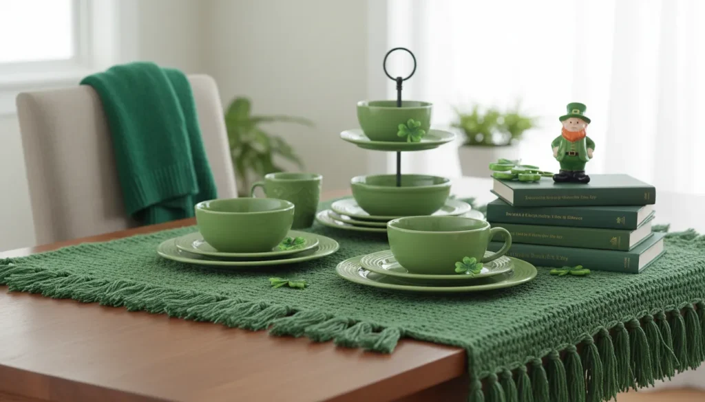 Quality wreaths in classic designs remain stylish indefinitely. String lights in standard green work for multiple occasions. Celtic knot decorations connect to heritage rather than trends. Solid-colored table linens in green transition across years and even other holidays.