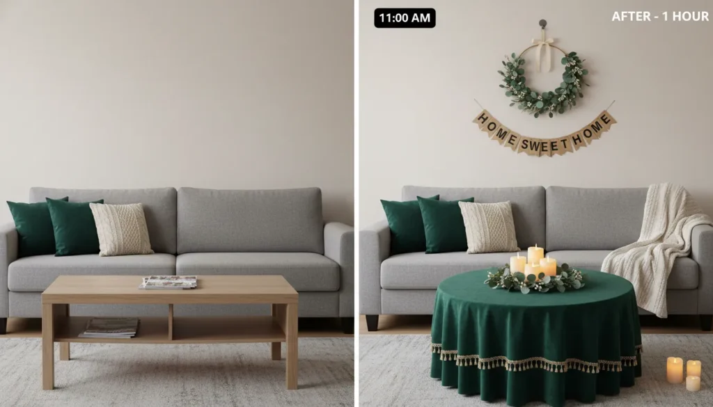 Minute 15-30: Living room quick hits. Toss green throw pillows on the sofa. Drape a green blanket across a chair. Hang a pre-made banner across the mantel or wall. Place battery candles in green holders on the coffee table. These five actions transform the space in minutes.