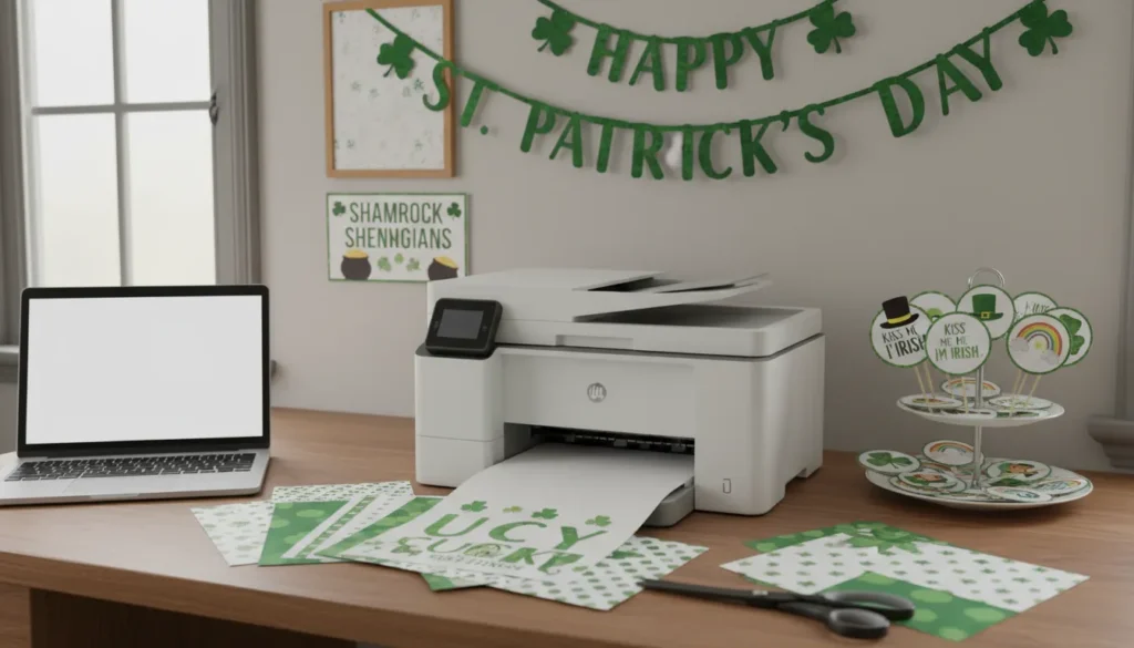 Printable decorations download immediately and print at home. Search for “free printable St. Patricks Day decorations” to find banners, cupcake toppers, signs, games, and more. Print on cardstock for better quality. Cut out and display within minutes.