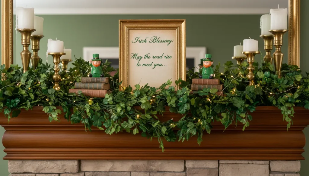 For the mantel, create a St. Patricks Day display using different heights and textures. Stack vintage Irish-themed books, add small potted plants with green foliage, include a leprechaun figurine or two, and finish with string lights for magical ambiance.