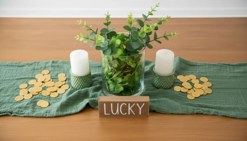 Coffee table centerpieces deserve special attention since they’re eye-level when guests sit. Try filling a clear vase with faux shamrocks, placing a pot of gold (chocolate coins work perfectly) on a green table runner, or arranging candles in varying heights with green and gold holders.