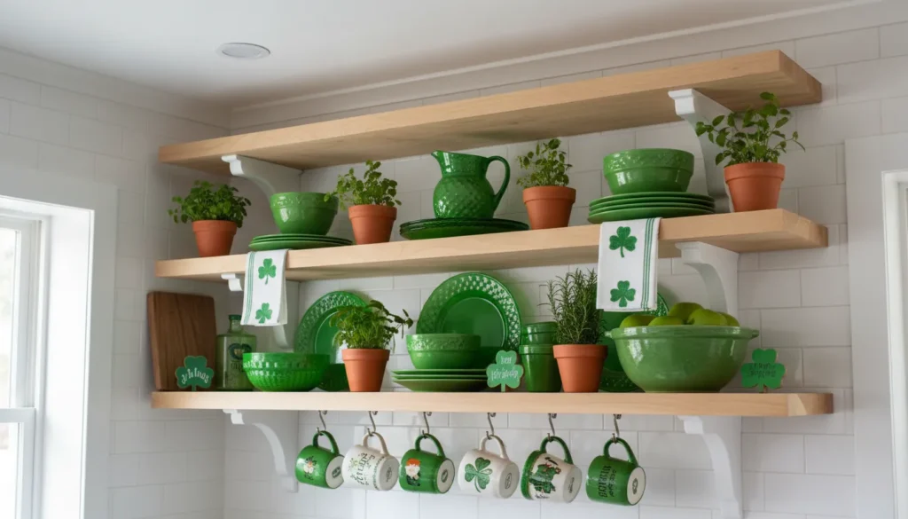 Cabinet and shelf decorations extend the theme without cluttering food prep areas. Display green vintage plates, arrange Irish-themed mugs, or add small shamrock accents to existing decor. In my kitchen, I swap out regular dish towels for festive St. Patricks Day versions—simple but effective.