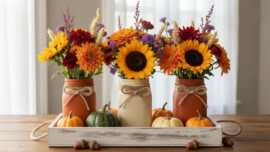 Paint three mason jars in fall colors (or leave them clear), fill with wildflowers or fall foliage, and tie with twine. Costs under $10!