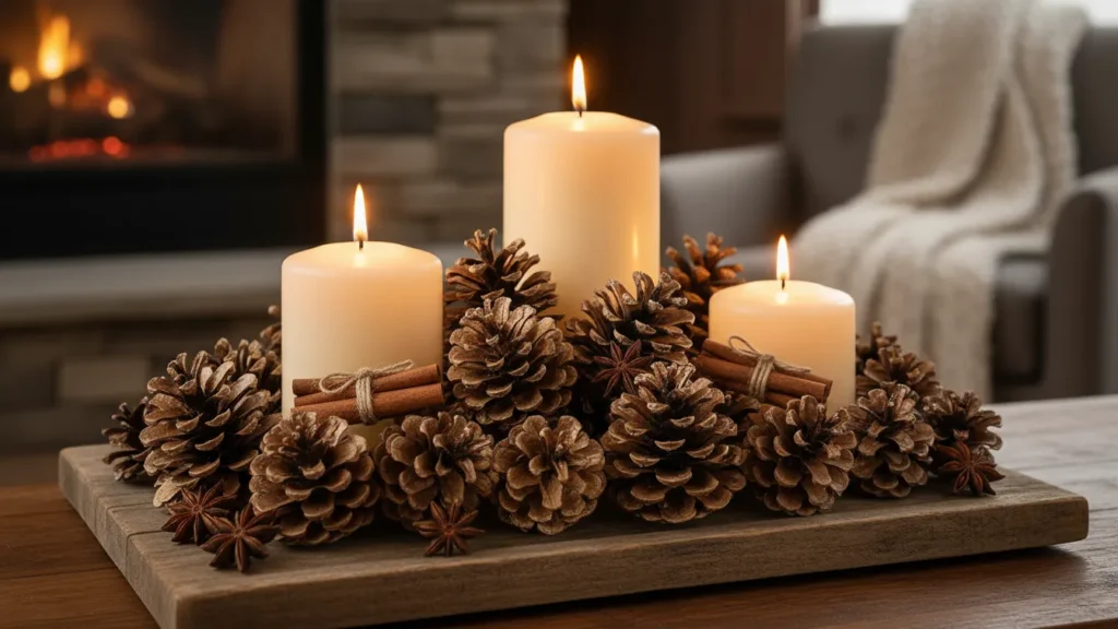 Collect pinecones from outside (free!), spray paint some gold if desired, and arrange them on a wooden board with pillar candles.
