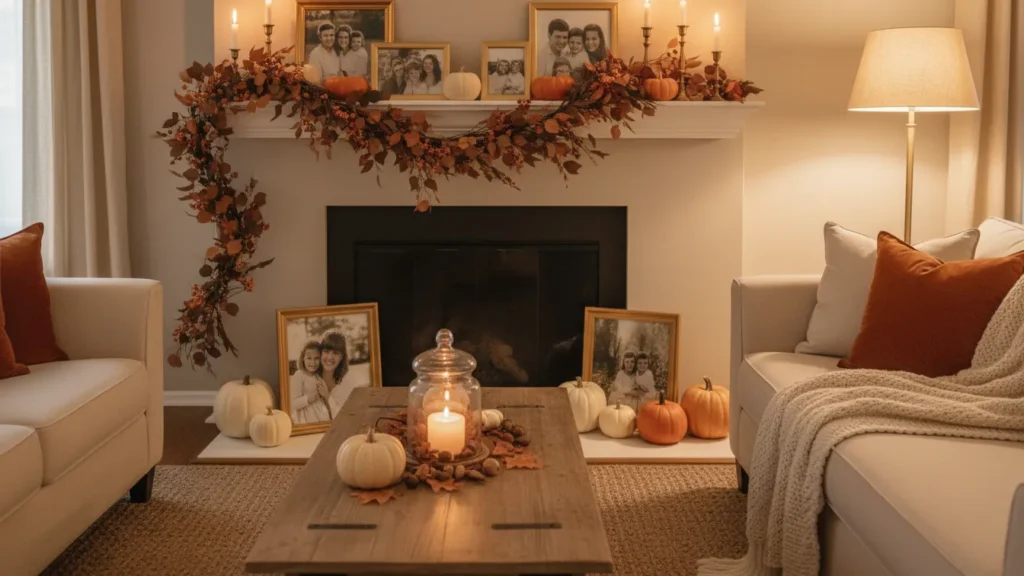 We touched on this earlier, but for the living room specifically, consider making your mantel more personal. Mix family photos in fall-colored frames with traditional seasonal elements.