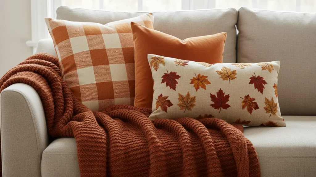 This is the easiest swap you can make. Add pillows in fall colors or with seasonal patterns (plaid, leaves, pumpkins) to your sofa. Drape a chunky knit blanket over the arm for texture and coziness.