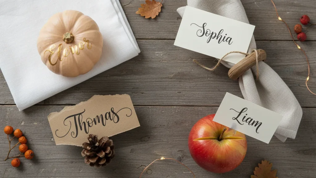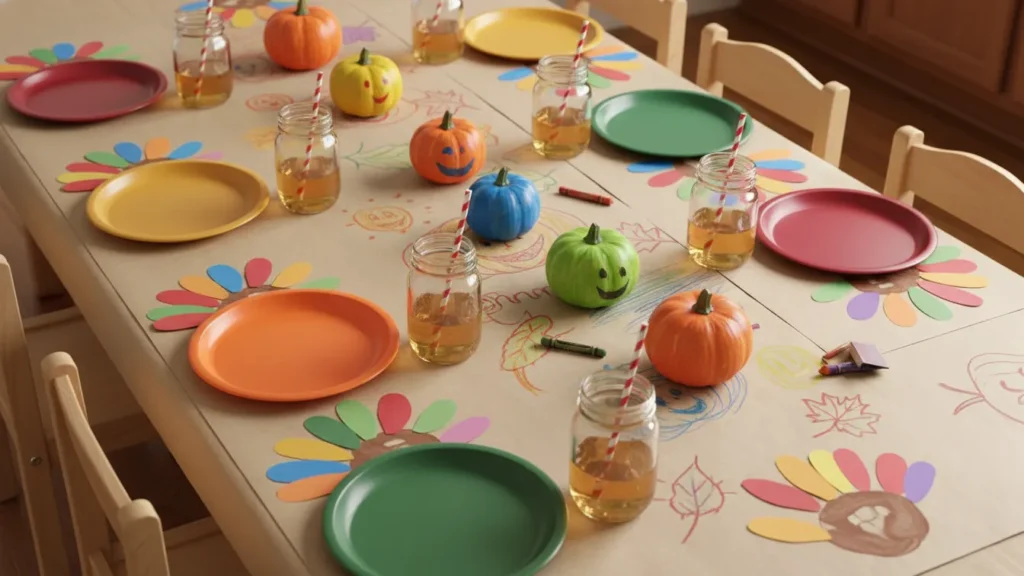 | Traditional | Orange, burgundy, gold, brown | Cornucopia, gourds, fall leaves, pilgrims | Classic homes, family gatherings | Moderate |
